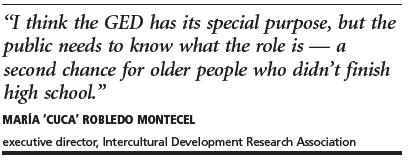 “I think the GED has its special purpose, but the public needs to know what the role is — a second chance for older people who didn’t finish high school,” said María “Cuca” Robledo Montecel, executive director for the San Antonio based Intercultural Development Research Association.