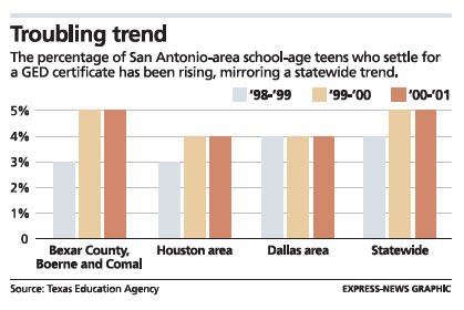 In Bexar County, the number of high school-age teens who received GED certificates has almost doubled, from 3 percent in 1998 to 5 percent in 2001, according to a computer analysis of Texas Education Agency data conducted by the San Antonio Express-News.