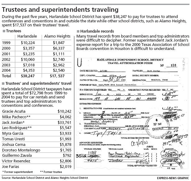 A review of hundreds of travel records and receipts showed trustees alone spent $38,247 from 1999 to 2004, despite facing budget shortfalls. By comparison, the board for the Alamo Heights School District, the wealthiest district in Bexar County, spent $17,537 in the same period.